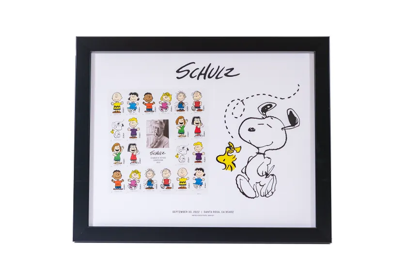 こちらはアメリカ合衆国郵便公社USPSより作者のチャールズ M. シュルツ氏の生誕100周年を祝い、アメリカで製造された切手セットです。スヌーピーや、ピーナッツ・ギャングがデザインされた10種類の切手が、ブラックフレームに収められた貴重なコレクターアイテムです。