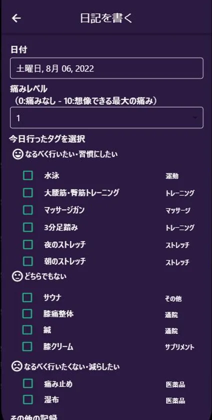 そうしたひざ痛の根本改善には、日々の症状とセルフケアを記録し、自分の症状にあったセルフケアを見つけ、セルフケアを継続することが重要です。