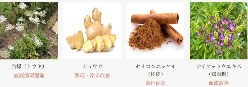 当帰(トウキ)・ショウガ・ケイヒ・ケイケットエキスなど、体を心から温め、血流改善を促進する生薬を配合しています。