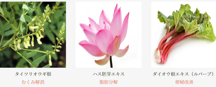 タイツリオウギ根・ハス胚芽エキス・ダイオウ根エキスなどが、体のむくみ脂肪の分解、便秘の改善を助けてサイズダウンへ誘導します。