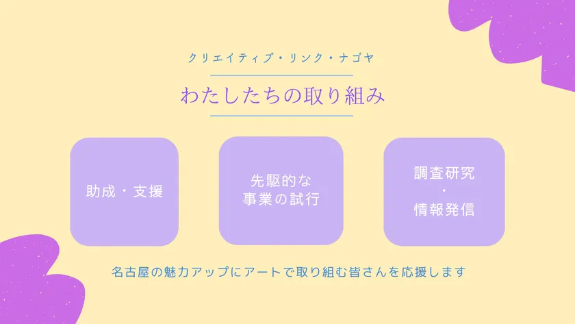 本助成は今後のクリエイティブ・リンク・ナゴヤの方向性を定めていく上で重要な取り組みとなります。
