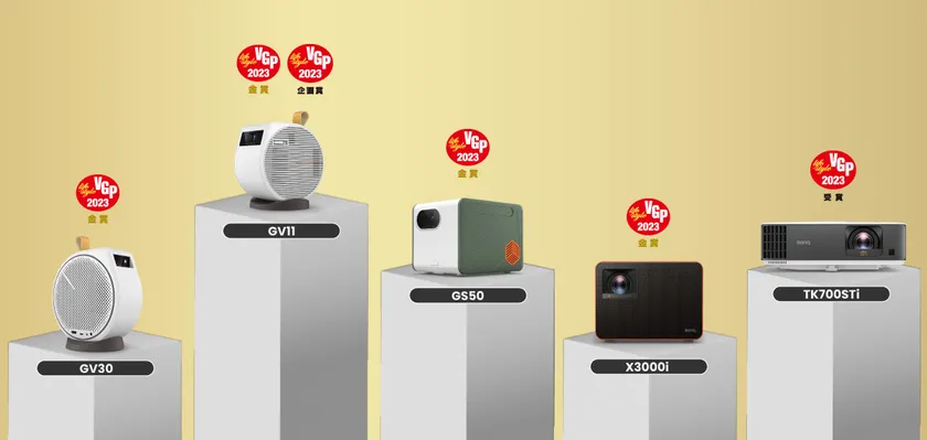プロジェクター製品で金賞に輝いた『GV11』『GV30』は天井投写機能を備え、『GS50』は、アウトドア仕様のモバイルプロジェクターです。『GV30』は2期連続での金賞受賞となります。さらに、「VGP2022 SUMMER」でゲーミング大賞を受賞した4K 4LEDゲーミングプロジェクター『X3000i』も金賞を受賞しました。
