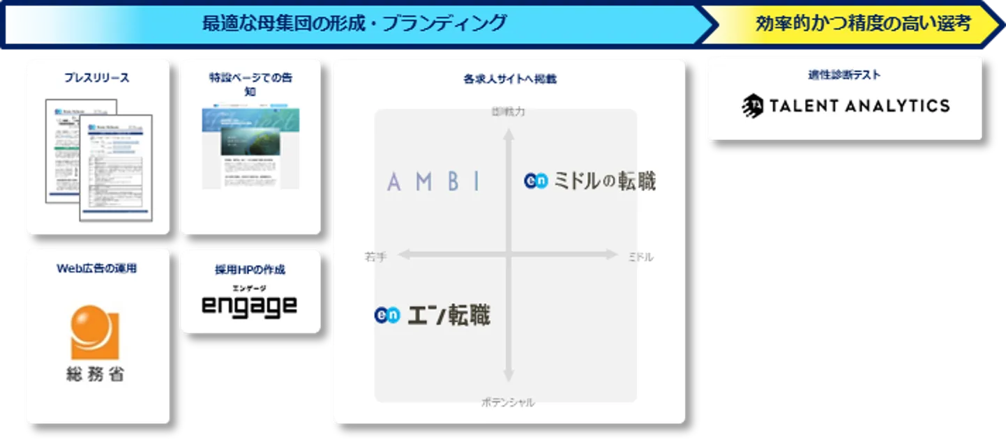 プレスリリースや特設ページ、Web広告での告知に加え、各求人サイトでの集客支援を行ないます。『エン転職』『AMBI』『ミドルの転職』とターゲットの異なる3つの求人サイトを活用することで、ターゲットへ網羅的に求人を届けます。WEB適正テスト『Talent Analytics(タレントアナリティクス)』も提供。選考フローの支援を通じて、求職者と同社の適切なマッチングを実施します。