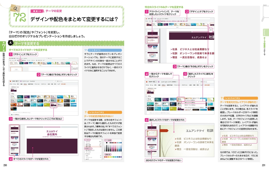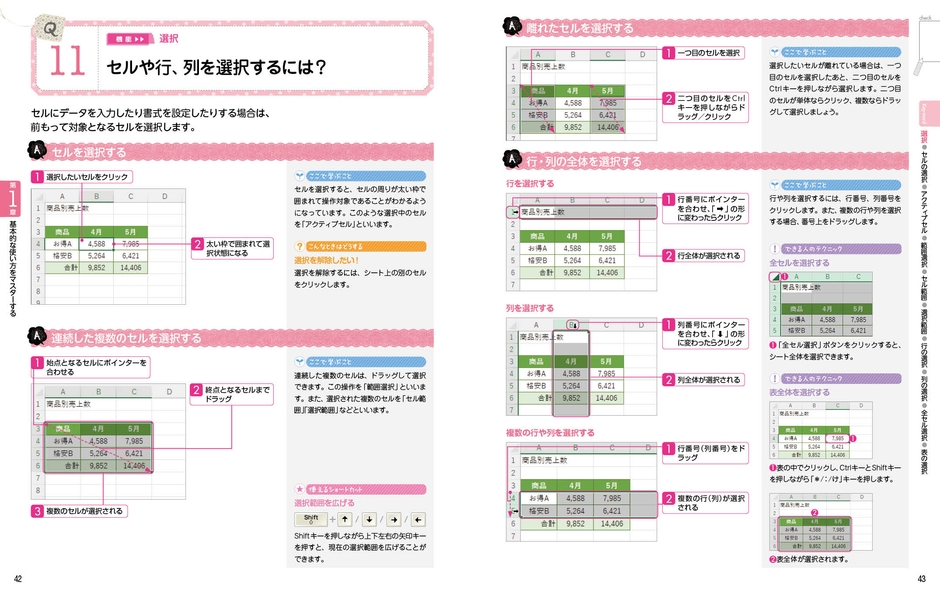 本書は、左半分が操作手順を実際の画面写真をもとに紹介する「使えるエリア」、右半分が操作の理由をわかりやすく解説する「わかるエリア」と2パートに分かれた構成を採っています。とりあえず手順だけ知りたい! という急ぎの場面でも、じっくりと理由まで理解したいという学びの場面でも、状況に合わせて活用していただけます。
