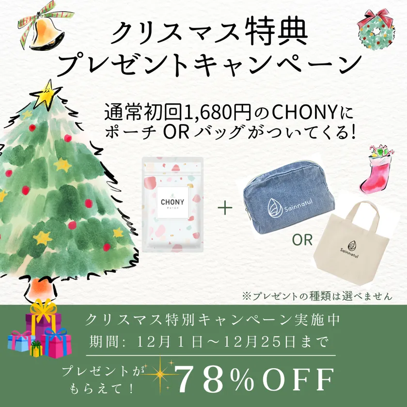 ANCHORパートナー株式会社 Sainnatul(サインナチュル)事業部(事業部所在地:東京都文京区)は、2022年12月1日からクリスマス特典キャンペーンを実施します。12月1日から12月25日までの期間は、クリスマス特別企画として、初回78%OFFの1,680円(税込)で腸活サプリ「CHONYチョーニイ」をご購入いただいたお客様にもれなくSainnatul(サインナチュル)オリジナルバッグ or ポーチをプレゼントいたします。