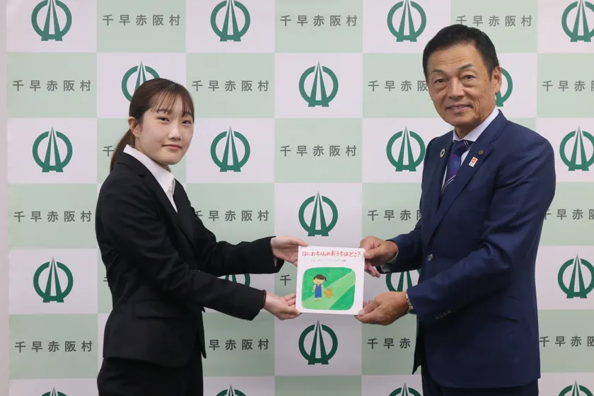 教育学部3年生歌坂 彩菜さん(左)と、千早赤阪村の南本 斎村長(右)