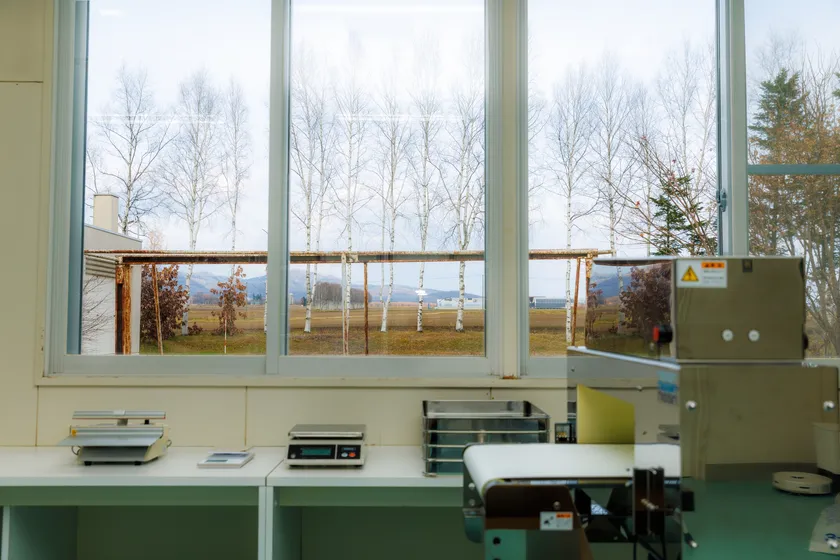 上士幌町の市街地から車で数分のところにある、自然豊かな廃校の1室を餃子工場に改装しました。工場の窓からは白樺並木と広大な畑が広がり、ときどきエゾリスの姿も見られるのどかな場所です。