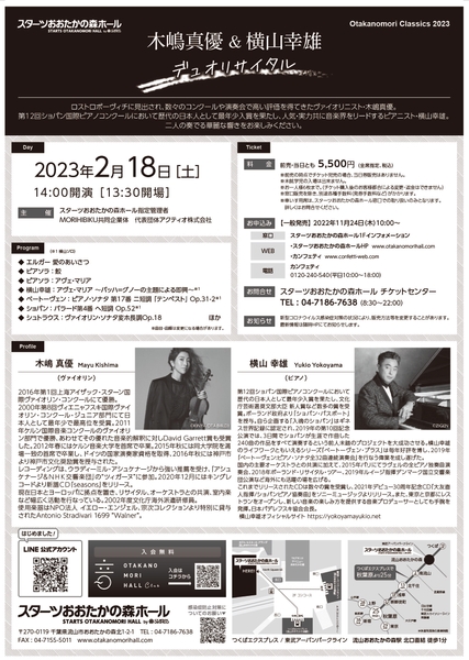 スターツおおたかの森ホール指定管理者MORIHIBIKU共同企業体 代表団体アクティオ株式会社主催、『木嶋真優&横山幸雄 デュオリサイタル』が2023年2月18日 (土)にスターツおおたかの森ホール(千葉県流山市おおたかの森北1-2-1)にて開催されます。チケットはカンフェティ(運営:ロングランプランニング株式会社、東京都新宿区、代表取締役:榑松 大剛)にて11月24日(木)10:00より発売開始です。