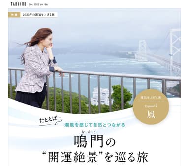 電子雑誌「月刊 旅色」12月号では、2023年に向けて運気を上げる旅を特集。旅を通して元気に、そして運気を呼び込むためにどうすればいいのか、人気の占い師・ぷりあでぃす玲奈さんに聞きました。2023年の開運旅のキーワードは「風」。開放感があって風を感じられる場所がいいということで、鳴門海峡を渡る風が気持ちいい徳島県鳴門市へ、土屋太鳳さんが訪ねました。