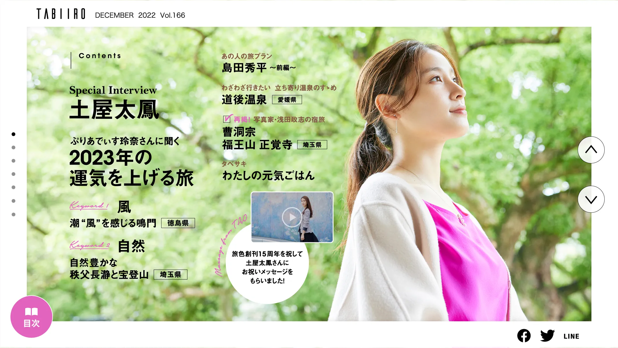 株式会社ブランジスタメディアが運営する電子雑誌「旅色」が、11月25日に創刊15周年を迎えました。記念すべき「月刊 旅色」2022年12月号では、表紙・巻頭に土屋太鳳さんを迎え、2023年の運気を上げる旅を特集。また、藤原紀香さん、彦摩呂さんをはじめ旅色にゆかりある5人の食通に、食べるだけで元気が出るごはんを教えてもらう特集や、手相占いで人気の島田秀平さんにプライベートの旅や実践する寺社仏閣の参拝の作法を聞く連載など創刊15周年にふさわしい内容で盛り上げます。