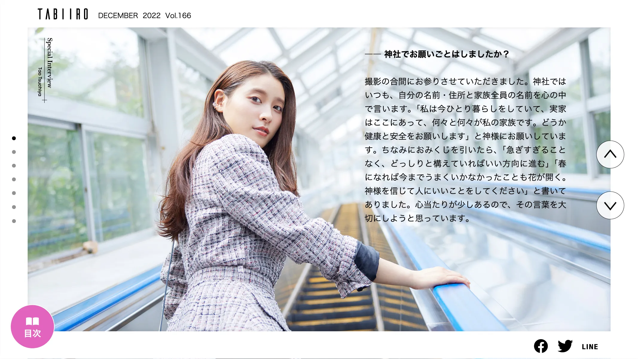 そのキーワードに沿って、土屋太鳳さんが徳島県県鳴門市へ訪れる特集も。地元で有名なパワースポットを訪ねたり、おいしいものを食べたり、美術館で心の栄養をチャージしたり、鳴門のよい運気をたくさん取り入れる様子をご覧ください。