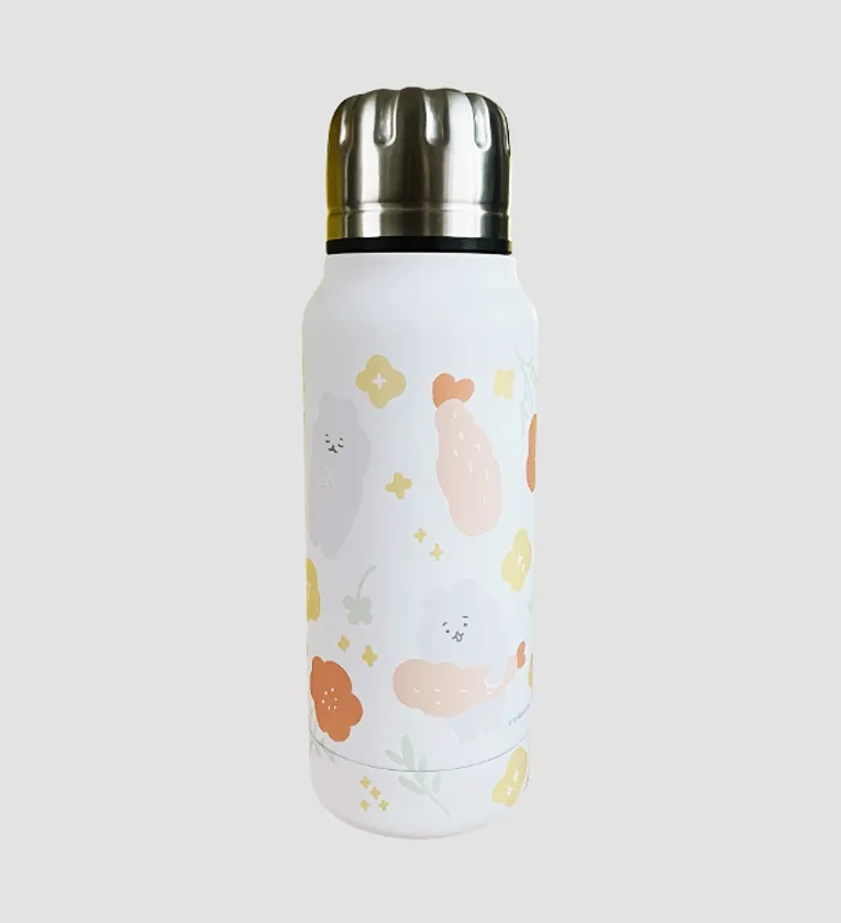 今回のボトルデザインは、普段使いしやすい、気持ちが和む、パステルカラーの花柄が特徴です。エビフライをもつキャラクターもとってもキュート。