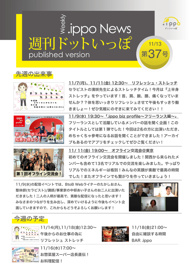 中でも、フリーランスとして活躍されているメンバーに出演いただき、フリーランスになったきっかけや仕事の取り方、新しい事業の始め方などをお話いただく、コミュニティ内限定の配信イベント「.ippo biz profile~フリーランス編~」は、普段聞くことができないフリーランスの生の声を聞けるイベントとして大変好評です。