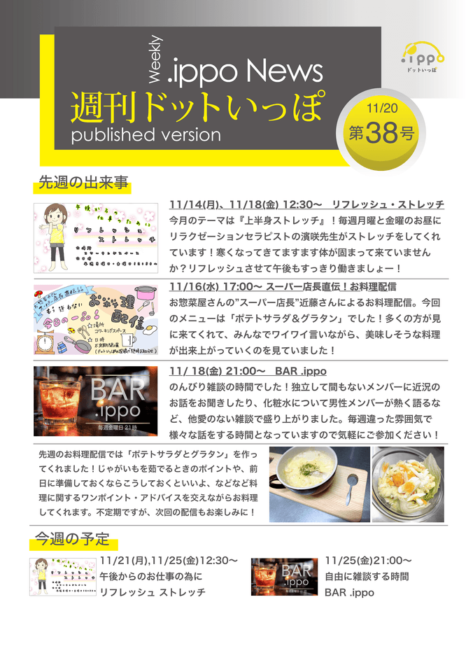 加えて、イベントに参加できなかった人でも、コミュニティ内の活動状況が分かるように、『週刊ドットいっぽ』というコミュニティ内の配信を毎週行っています。コミュニティ内での様々な活動をコミュニケーションのきっかけにして、様々なつながりを作っていただけるよう、今後も工夫を重ねてまいります。