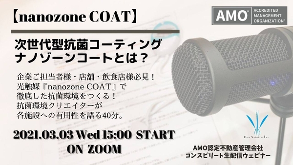 株式会社コンスピリート(所在地:東京都目黒区自由が丘、代表取締役:村上幸生)は抗菌環境構築をご検討中の企業ご担当者様・店舗・飲食店様向けに、3月3日(水)光触媒『nanozoneCOAT』の無料解説ウェビナーを開催します。