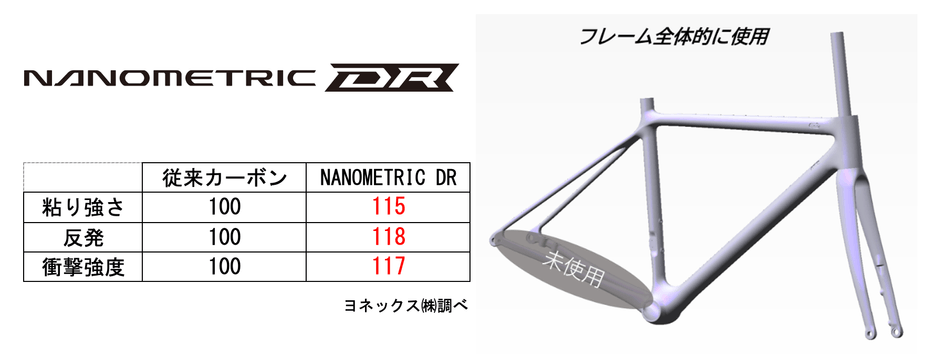 さらに、「粘り強さ」と「反発性能」を高次元で両立する、弊社独自のナノサイエンスを駆使した素材「NANOMETRIC DR(ナノメトリック ディーアール)※4」をフレーム全体に使用することで、少ない基材量で性能を維持することに成功。高強度でありながら従来品に比べ約16%※5の軽量化を実現しました。