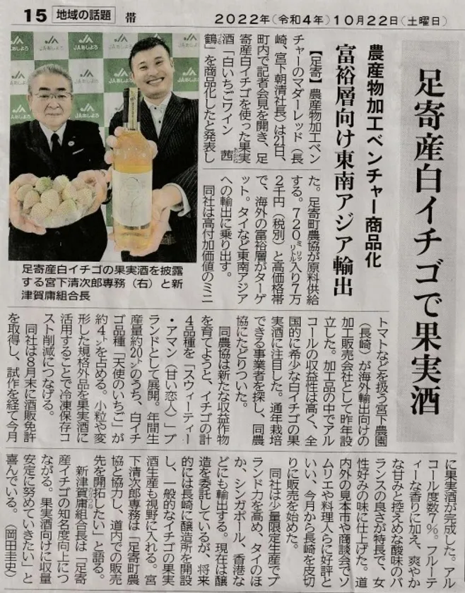 宮下農園(所在地:長崎県諫早市、代表:宮下 清次郎)の加工販売会社・株式会社Madder Red(読み:マダーレッド、所在地:長崎県諫早市、代表取締役社長:宮下 朝清)にて商品開発し、国内でも非常に珍しい白いちごを100%使用し醸造した「茜鶴 白いちごワイン」を2022年11月30日(水)11:00から当社ホームページやSNS、電話にて販売開始いたします。また、2022年12月からは、北海道足寄町のふるさと納税返礼品として取り扱い予定です。