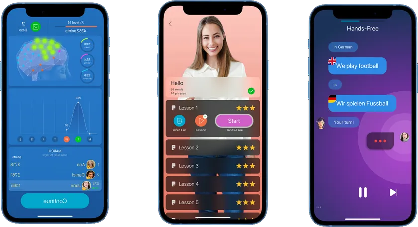 (左)グラフィカルな学習進捗、(中央)すぐにわかる学習履歴、(右)ハンズフリーでの会話演習