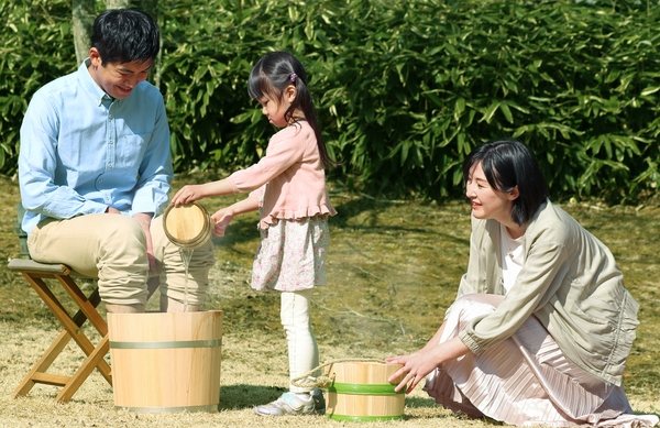 トンボの湯の前にある森に囲まれた広場に、家族ひとりにひとつずつ温泉を満たした足湯桶を用意します。美肌の湯で知られる星野温泉を使用し、トンボの湯の湯守スタッフが、足湯の湯温が下がり始める頃合いをみて、天秤棒を担いで温泉を運び、湯温を調整します。家族にひとりずつ湯桶が用意されるので、家族それぞれ湯温の好みが異なっていても、誰かに合わせることなく、自分の好みに応じて湯温を調整することができるのがこのサービスの特徴です。
