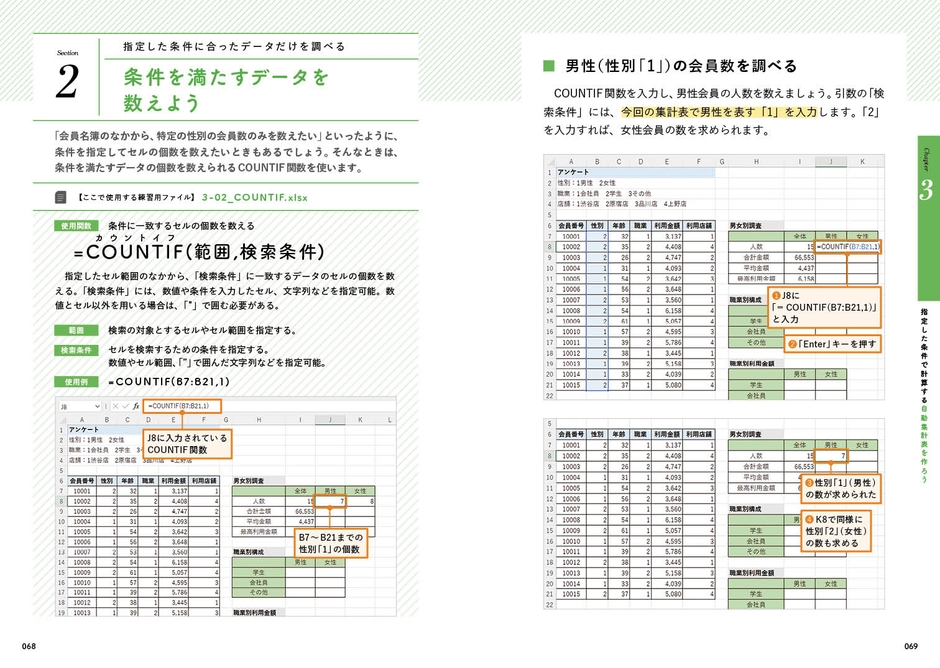 エクセル関数を覚えるには、実際にどのような場面で役立つのかを理解することが近道となります。本書は、「集計表」や「管理表」「一覧表」などの使用頻度の高い表、さらには日時や品目情報などが自動で入力される「定型文書」などの作り方を通じて、エクセル関数の役割と構文の書き方を学ぶスタイルとなっています。関数自体とその活用法を同時に学べる構造です。