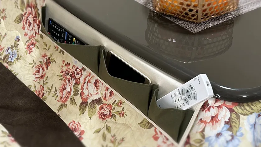 こたつの上の散らかりがちなリモコンやメガネ、スマートフォンなどの小物をすっきり収納できる浅型ポケットです。ベットサイドポケットしてもご使用いただけます。