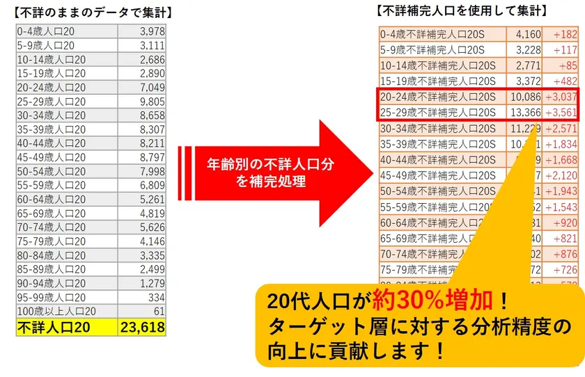 マップマーケティングではこれを補うため、市区町村単位で発表される不詳のない統計データを用いることで、町丁目データの年齢別の不詳人口分を補完し、精度の高いデータに変換しております。町丁目データを用いた分析をされるお客様においては不詳補完された統計データをお勧めしております。