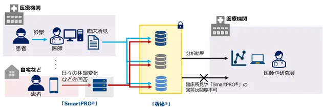 患者は、「SmartPRO(R)」を使い日々の体調変化などプライベートな内容を自身のスマートフォンから回答します。収集された回答は、「析秘(R)」により医師や研究員にも患者の氏名や年齢などの個人情報や回答内容が秘匿化された状態で分析され、その結果のみ医師や研究員にフィードバックされ、新たな治療法の開発などに役立てられます。なお本研究では、NTT Comデザイン部門との連携による患者へ分析結果をフィードバックする手段の提供に加え、臨床所見とPROを秘匿化したまま横断的に分析することや、複数の施設から収集された臨床所見とPROを秘匿化したまま分析する多施設共同研究も実施予定です。