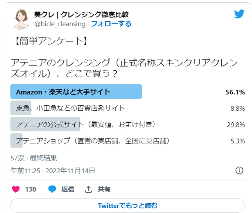 株式会社バズベイト(本社:東京都中央区、代表取締役:古澤 純哉)は、クレンジング専門メディア「美クレ」において、アテニアのクレンジング(正式名称スキンクリアクレンズオイル)の購入場所に関する独自SNSアンケートを、2022年11月17日~2022年11月21日の期間に実施しました。