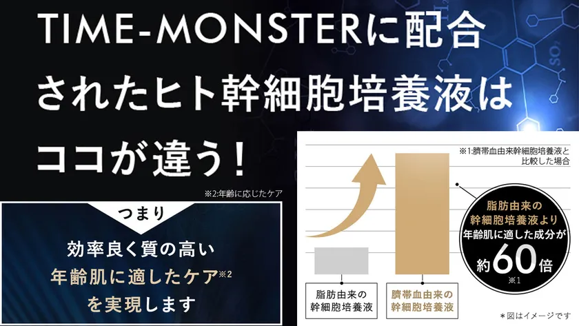 約60倍(※1)の年齢肌に適した特化成分(※2)を含有した臍帯血由来のヒト幹細胞培養液を採用しています。美容で使用される培養液は、人の皮下脂肪から採取した脂肪由来の幹細胞培養液がほとんど。しかしTIME-MONSTERは「臍帯血由来」のヒト幹細胞を使用し、年齢肌に適したケアに特化した因子の発現を約60倍(※1)含有しています。