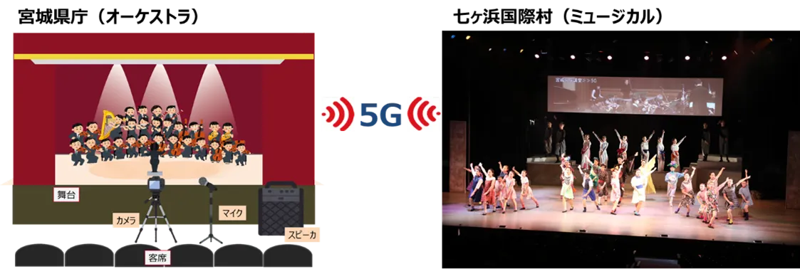 株式会社NTTドコモ東北支社(以下 ドコモ)、NTTコミュニケーションズ株式会社(以下NTT Com)は、宮城県発注の「令和4年度地域課題を解決する5G技術を活用した実証モデル事業」を受注し、2022年11月19日(土)に宮城県庁講堂と七ヶ浜国際村を「高速・大容量」「低遅延」「多数同時接続」が特長の第5世代移動通信システム(以下 5G)で繋ぎ、リモート演奏によるミュージカル開催の実証実験(以下 本実証)に成功しました。