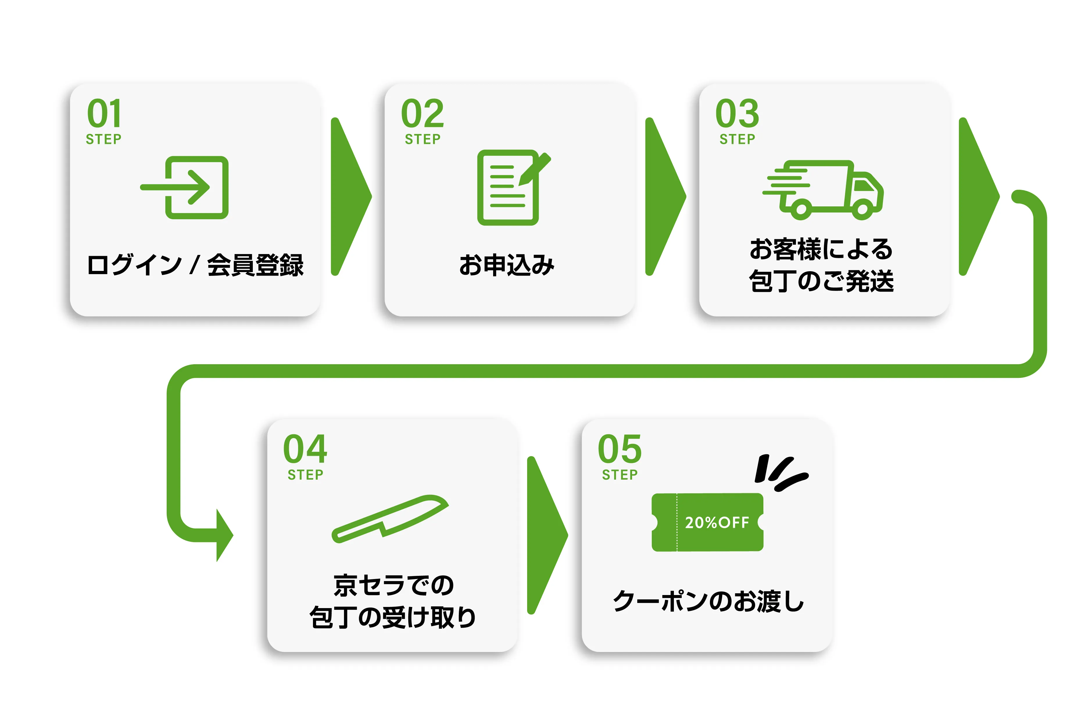 各ご家庭で不要になった調理用包丁(メーカー・素材不問)を期間中に所定の方法にてお送りください。送られた包丁は京セラが責任をもってリサイクルを行います。また、受け取り後には、「京セラキッチンオンラインストア」で利用可能な20%オフクーポンをお送りいたします。