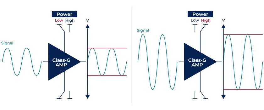 「ES9270C」はG級アンプを備えています。再生する楽曲などの音声信号レベルが低いときは、より低い電源電圧を使用し、信号レベルが増加すると、自動的に適切な電源電圧に切り替わります。信号レベルの大きさに合わせて効率良く動作することで、接続端末の電源使用量を最適化し、省電力ながらも音声の出力レベルを問わず常に再現性の高い楽曲再生が可能です。