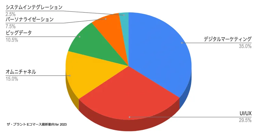 ■以上の要因からも、2023年に重要になっていくであろうEコマースの課題は、デジタルマーケティングとUI/UXの項目が大きく占めていくであろうと推測できます。