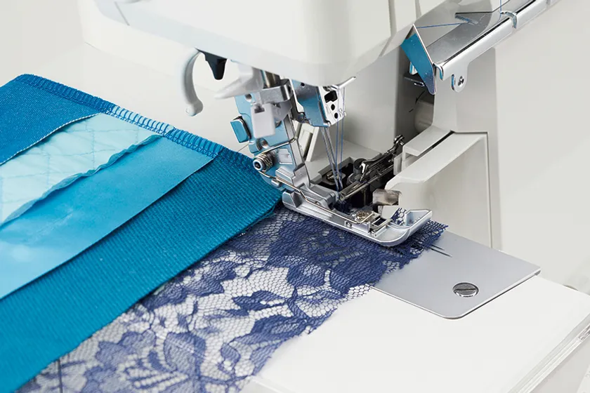 ロックミシンは、布端のほつれを防止するための「カットと縁かがり縫い」を行うほか、伸縮性のある布の縫い合わせやニットフリルの巻き縫いもでき、家庭用ミシンや職業用ミシンと組み合わせて使用されることが多い専門性の高いミシンです。