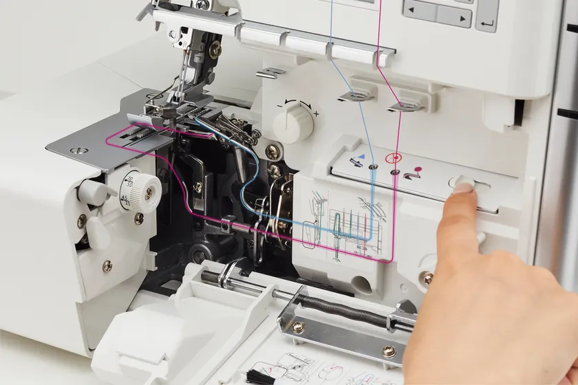ロックミシン特有の複雑で難しい上下ルーパー糸通しを簡単にできる「イージースレッダー(自動ルーパー糸通し)」を搭載。エアオン状態を保ったまま糸通しができるため操作性が向上。