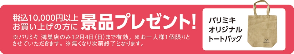 オープンを記念し、税込10,000円以上お買い上げの方に、パリミキオリジナル「トートバッグ」をお一人様1個プレゼント! ※12/4(日)まで。無くなり次第終了となります。