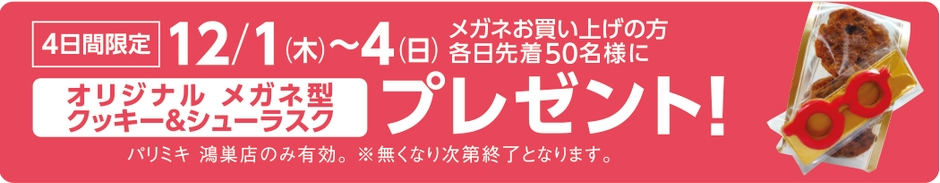 オープンを記念し12/1(木)~4(日)の4日間、メガネをお買い上げの方 各日先着50名様に、オリジナル「メガネ型クッキー&シューラスク」をプレゼント! ※無くなり次第終了となります。