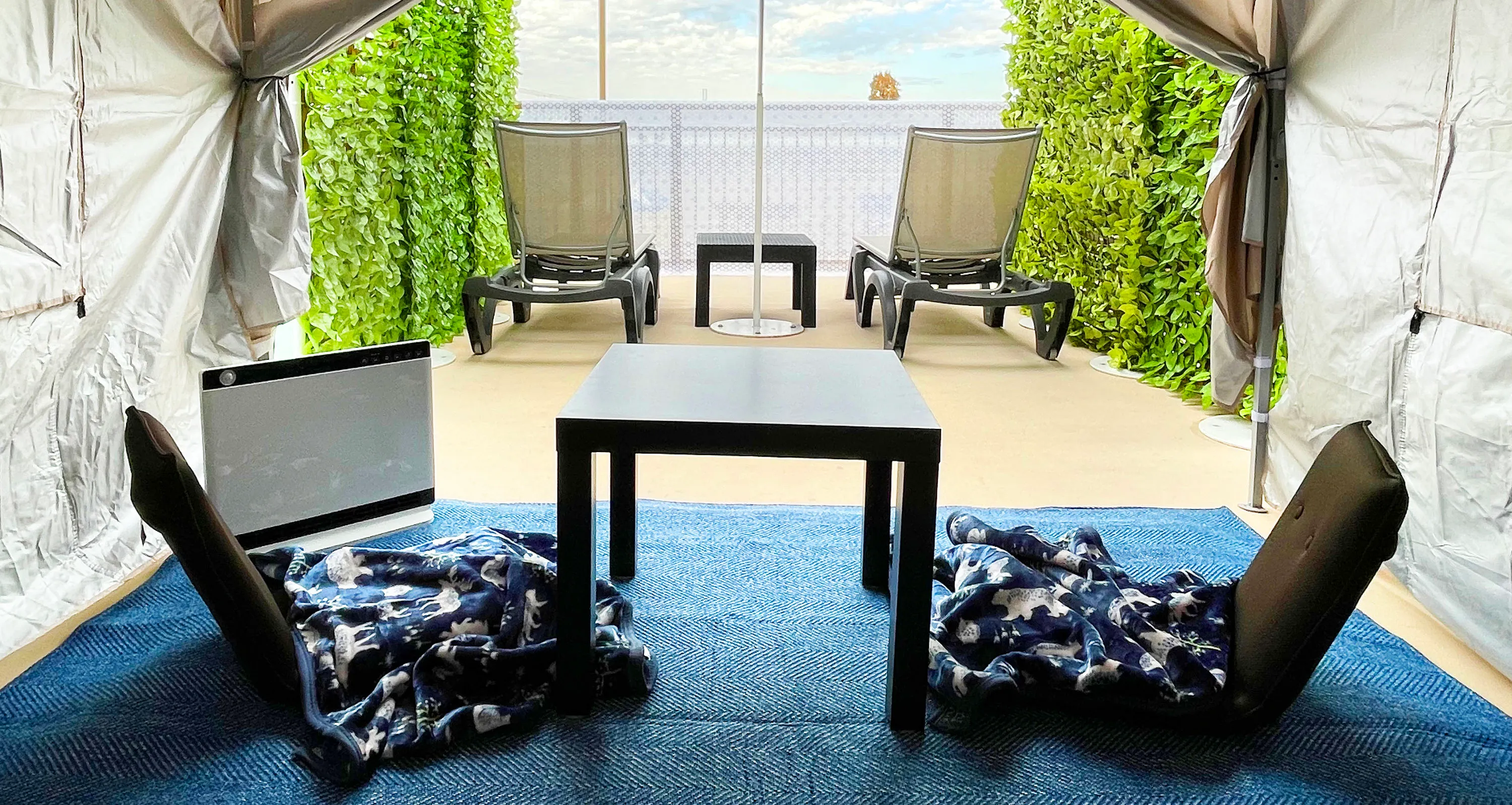 ブランケット2枚、座椅子2脚、デッキチェア2脚、ミニテーブル2台、