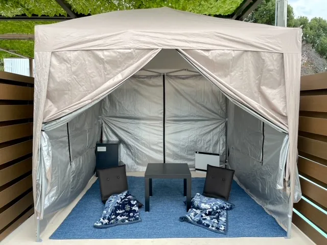 セラミックヒーター1台、タープテント1張り、パラソル1本