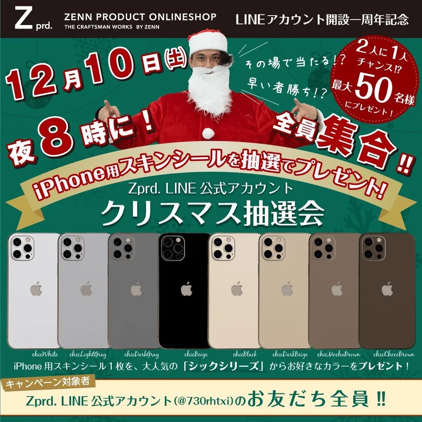 スキンシールを販売するオンラインショップZENN PRODUCT(所在地:北海道札幌市、代表:鶴岡康弘)は、2022年12月10日(土)20時~、LINE公式アカウント開設1周年を記念して、抽選で50名様にiPhone用スキンシールをプレゼントする「クリスマス抽選会」を開催いたします。