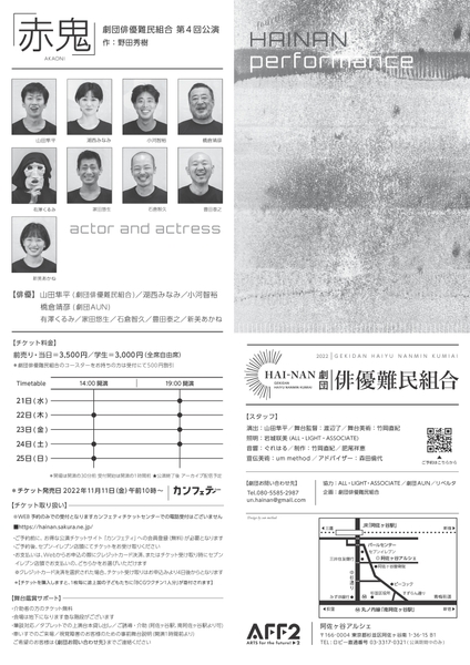 劇団 俳優難民組合主催、第4回公演『赤鬼』が2022年12月21日 (水) ~2022年12月25日 (日)に阿佐ヶ谷アルシェ(東京都杉並区阿佐谷南1-36-15 レオビル地下1F)にて上演されます。