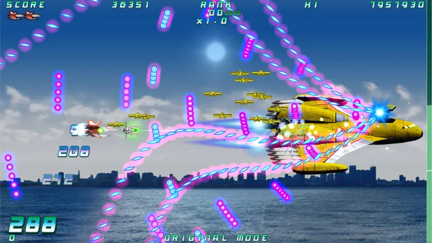 自機の周りを回るローリングガンを上手く制御しながら敵を撃破していきましょう。自機のショットが強化され、移動速度が速くなる「ファイターモード」、移動速度は遅くなるがローリングガンが強化される「ガンナーモード」を上手く使い分けるのが攻略のコツとなります。