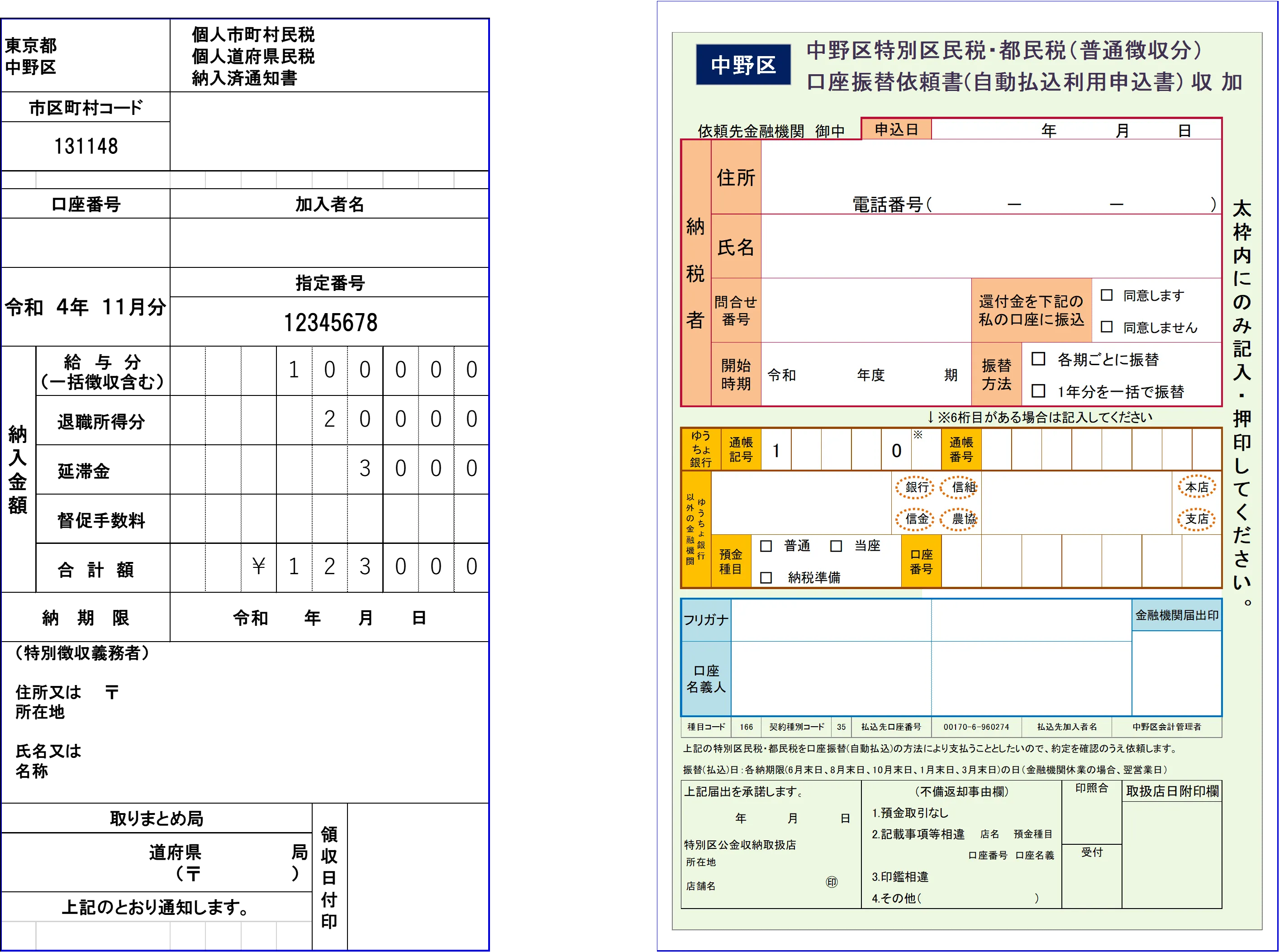 代表的な帳票の特別徴収納入済通知書(左)と口座振替依頼書(右)