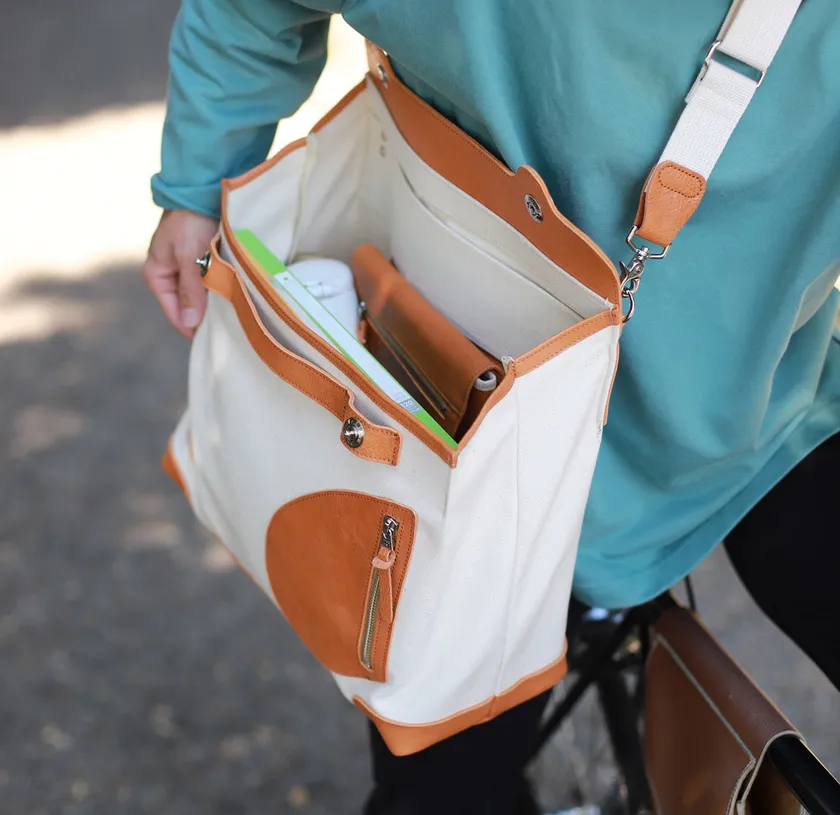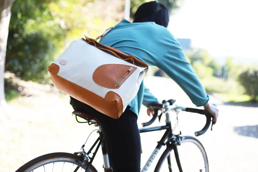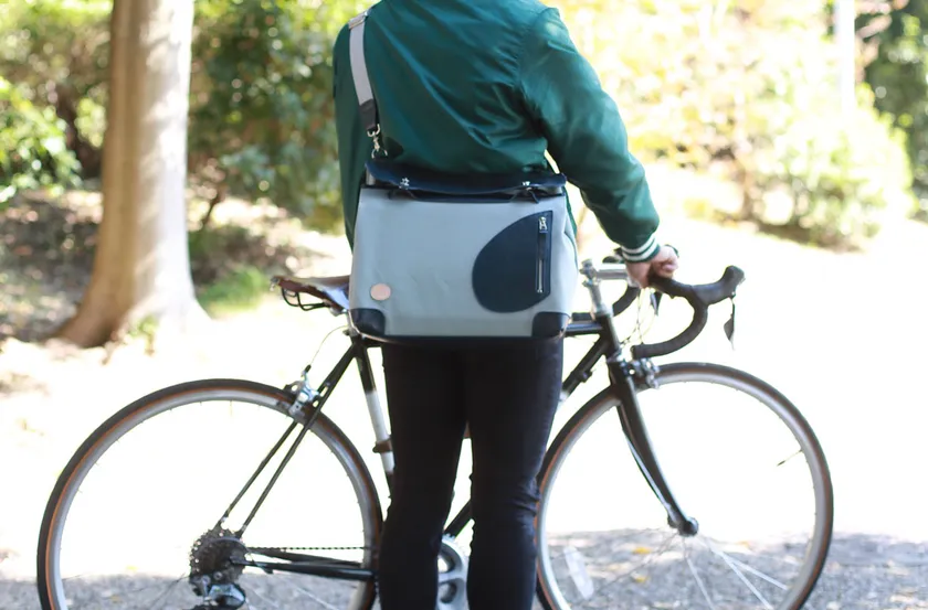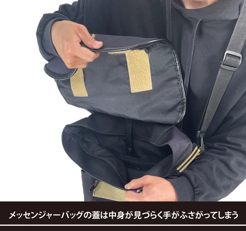 郵便配達員の鞄はポストマンバッグと呼ばれ、口が大きく開いて自転車やバイクに乗ったままでも中身が取り出しやすくできています。通常のポストマンバッグは、カバンの口に「口金」というパイプなどの金具を入れて大きく開くように形を作ります。ただ、この口金がカバンの口に自由がきかず体にあたると痛く、重さも重くなってしまいます。「メッセンジャーポストマン」にはこの口金を使わず縫製と型紙の試行錯誤で自由度の高い「ガバッ」と開閉を可能にしました。