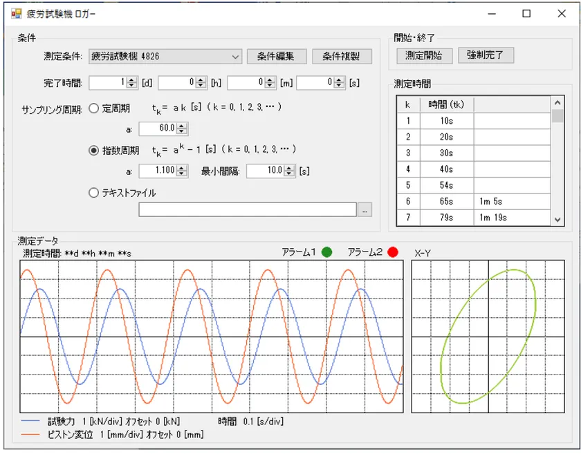当研究室では疲労試験機の荷重と変位信号と同期して高速度カメラで試験片の撮影を行う構成となっています。計測の周期や計測時間などは任意に設定可能です。通常疲労試験には数時間を要します。その間データをロギングすると膨大なデータが作成されます。例えば1分間隔で5秒間のロギングを繰り返す設定が行えるため、従来のような長時間ロギングによる膨大なデータの分析が不要となります。