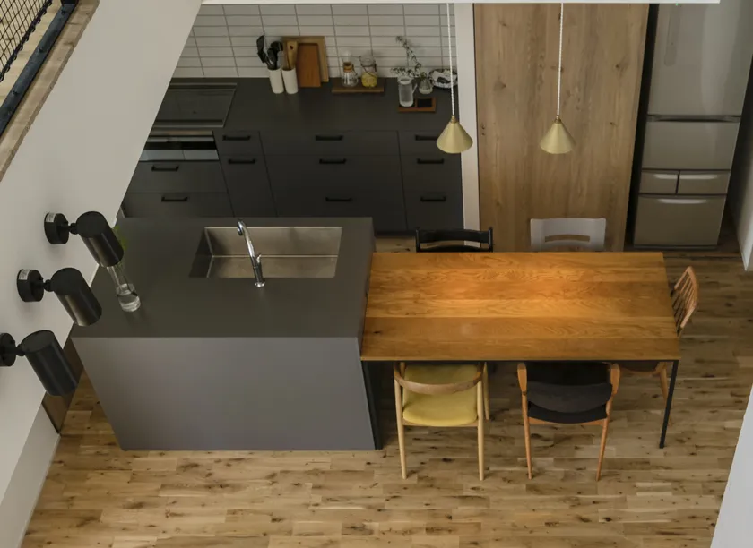 当初、妻・Mさんは、シンクとコンロが一体となったアイランドキッチンで、ダイニングテーブルを直角に置くT字型のレイアウトを希望していました。これは、テーブルがリビング側に張り出す形となりますが、夫・Kさんはできるだけ広いリビングを要望。そこで、二人のご希望を両立させるため、シンクとコンロを別々のカウンターに分けたセパレートキッチンを採用しました。