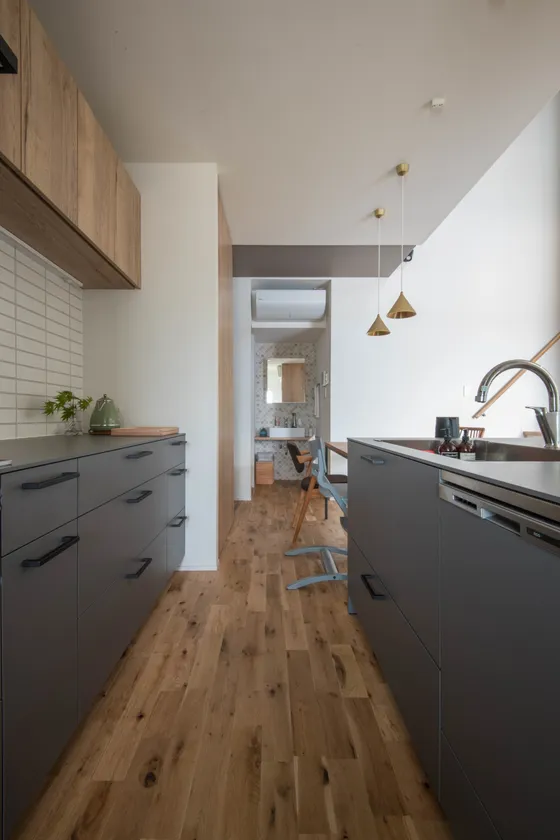 妻・Mさんは、キッチンにいることが多いため、シンプルな横移動で炊事や洗濯ができることを希望していました。そこで、キッチンの奥に脱衣所と浴室を設け、キッチンを挟んだ反対側に洗面所を配置。浴室、キッチン、洗面所を一直線に並べたシンプルな動線にしました。誰かがお風呂に入っていても、洗面所が使えるよう、脱衣所と洗面所はあえて分けました。料理だけでなく、家事全体の動きを考え、効率よく快適な暮らしができるよう工夫を凝らしています。