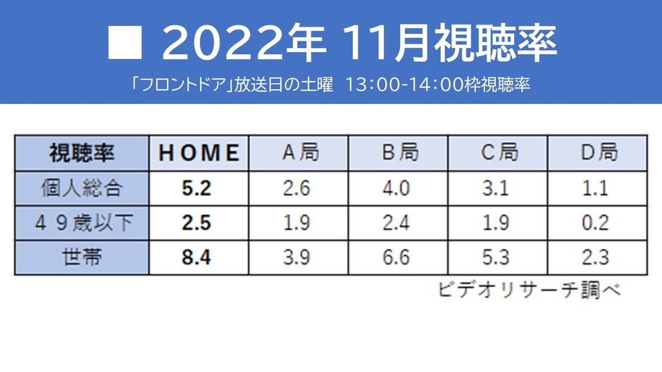 11月の月間 同時間帯視聴率(※)が、個人全体視聴率・世帯視聴率・49歳以下視聴率において、いずれも1位を獲得いたしました。個人全体および世帯については、2022年4月から8カ月連続で首位となっています。 (※)「フロントドア」放送日の(土)1300-1400枠視聴率