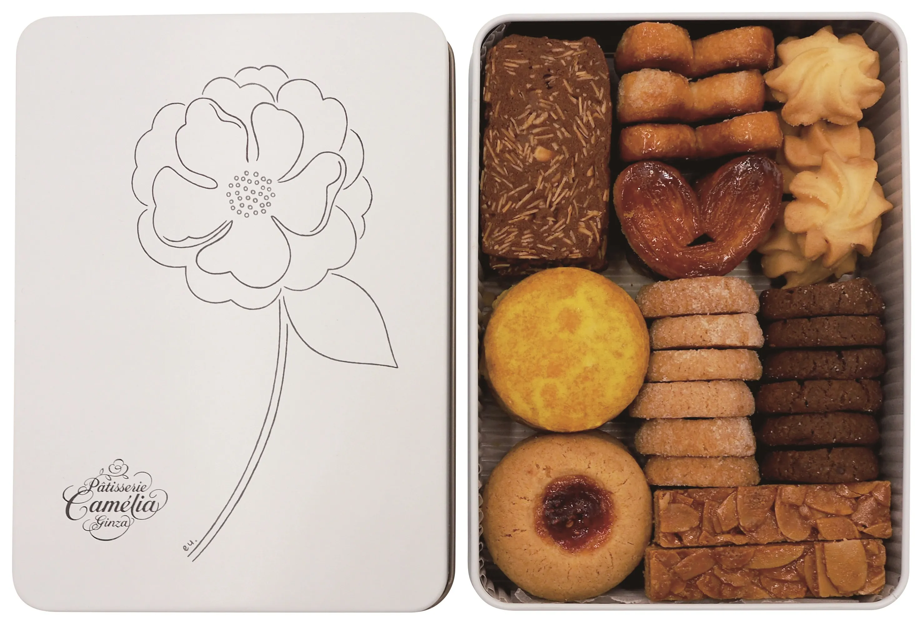 定番フレーバーのサブレバニーユ、サブレショコラ、フロランタン、サブレシトロンと、新商品のサブレアマンドショコラ、パルシエ、ハロングロットル、ヴィエノワの8種類のクッキーを、お店の名前カメリアをデザインした缶に詰めました。