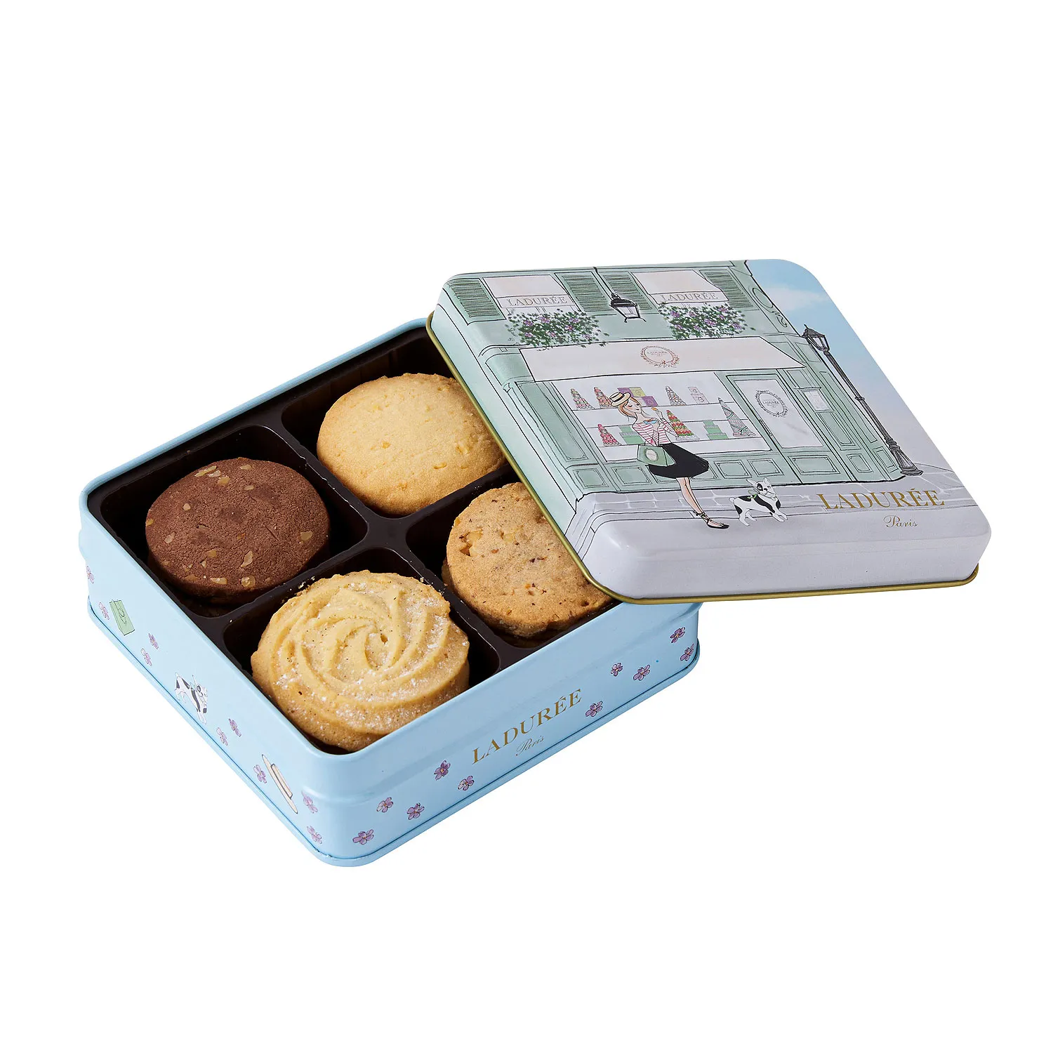 ヴィエノワ、ナンテ、ノワゼット、ショコラ・ノワゼットの4種類のサブレを詰め合わせたメタルボックス。おしゃれなパリジェンヌがフレンチブルドックと一緒に<ラデュレ>にお買い物へ出かけるキュートなデザインで贈り物やお土産にもおすすめです。